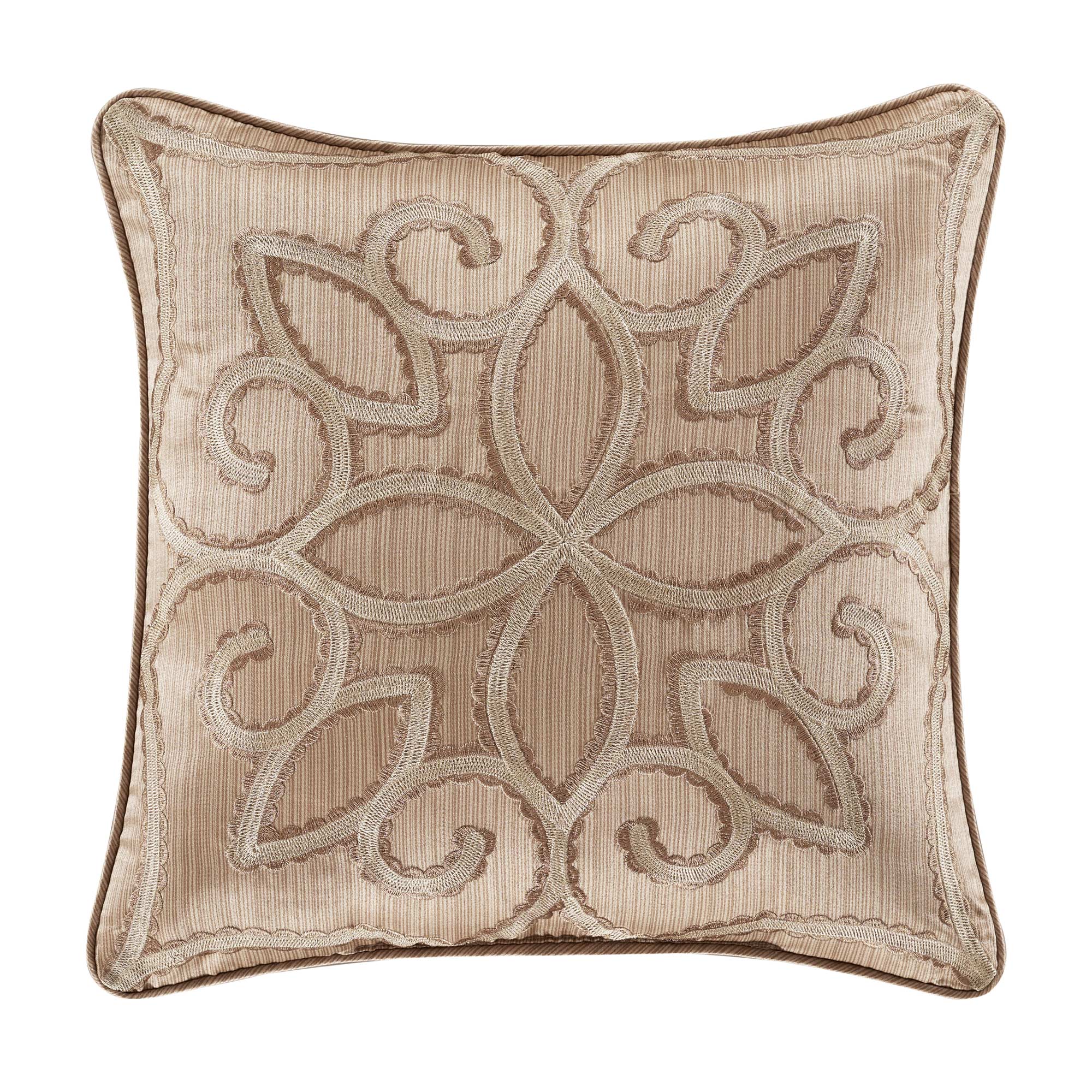 The Decade 18” Square Decorative Throw Pillow Is Boldly Embroidered With A Modern Geometric Pattern And A Scallop Edging Motif On Top Of A Lustrous Stria Satin Fabric In Gold Tones. This Luxurious Accent Pillow Reverses To A Sleek Stria Satin And Self-Cord Finish. Pair This Luxury Accent Pillow With The Decade Bedding Collection By J. Queen New York To Complete The Look.