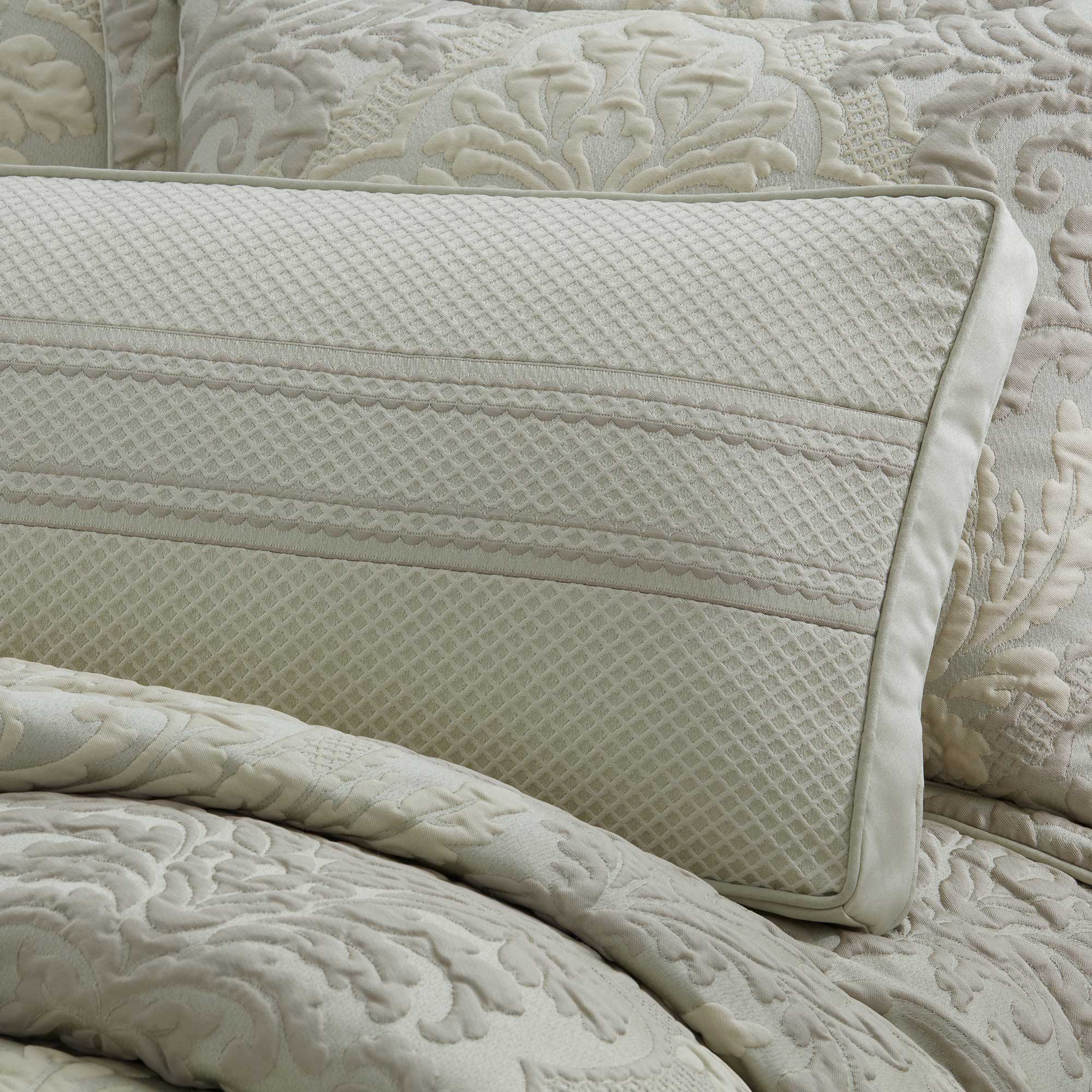 The Leonardo Reading Bolster Adds A “Luxury Hotel” Dimension To The Collection Of Decorative Pillows Offered. The Oversized Accent Pillow Spans The Width Of The Bed And Is Perfect For Propping Up When Reading. It Is A Reversible Pillow, Featuring A Soft Celadon Green Matelassé Border As A Horizontal Band And An All-Over Matelassé Trellis Pattern On The Opposite Side. Created With A 2 ½” Gusset For Added Loft And Support And It Is Finished With Delicate Soft Satin Piping.