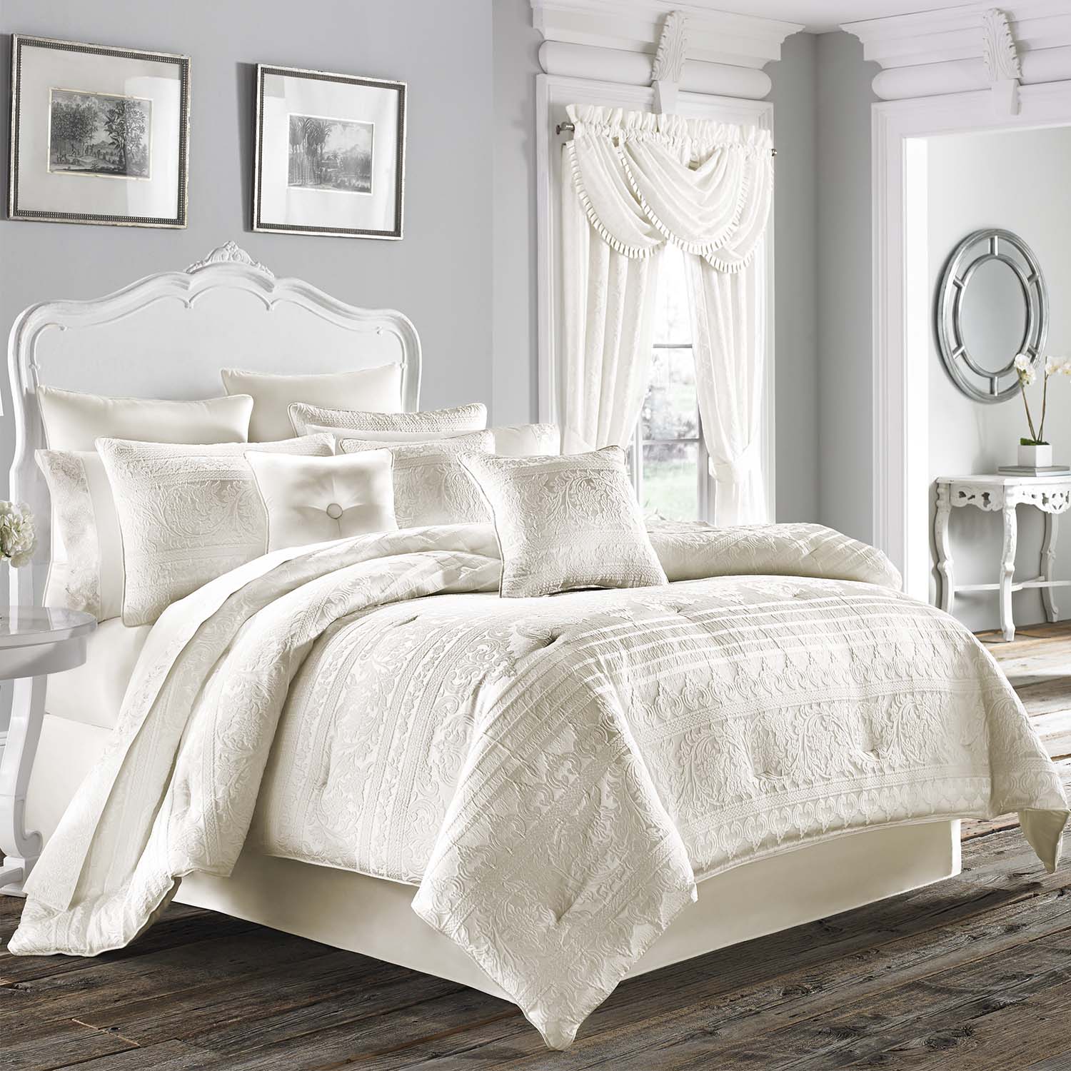 Elegantly detailed borders are combined to create this luxurious bedding ensemble. A special washing process gives the fabrics a unique three-dimensional quality. The comforter and all accessory items are carefully cut and sewn by pattern. The color palette is pure white.