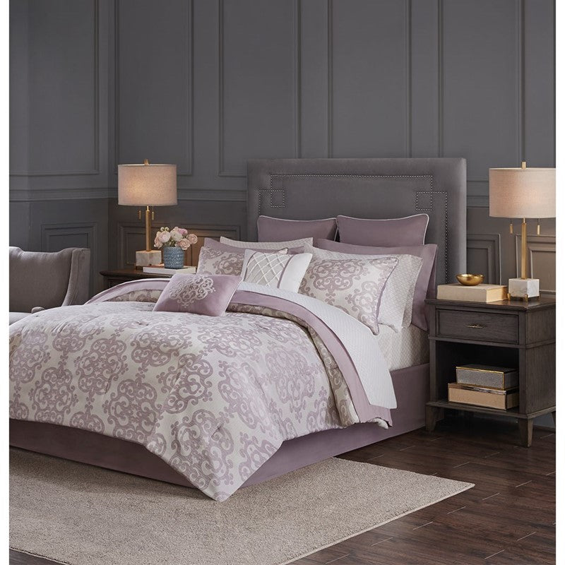 Transform your bedroom with the luxurious style of the Madison Park Essentials Madeline 16 Piece Jacquard Complete Bedding Set with 2 Sheet Sets. The jacquard comforter features an all-over damask motif in a purple hue on a ivory base, for an elegant transitional look. The solid purple reverse complements the top of the bed and pairs perfectly with the solid purple bedskirt. Matching shams and coordinating solid Euro shams complete the jacquard comforter set, while two decorative pillows with embroidery and pintuck details provide the finishing touches. Also included are two complete sheet sets with fitted sheets that fit a mattress depth up to 16 inches. One sheet set features a medallion print and the other is a solid hue that coordinates back to the comforter set. Hypoallergenic filling in the comforter and decorative pillows provide exceptional warmth and comfort. Bringing the best in health and wellness, this bedding set also features an anti-microbial treatment that provides built-in freshness protection, reducing the growth of odor causing bacteria and keeps fabric lasting longer. With everything you need to decorate your bed, this 16 piece comforter set is machine washable for easy and offers a stunning transitional update to your bedroom decor. This bedding set may come in rolled or compressed packing and will need to be fluffed up. Use a steam iron to help remove wrinkles easier.