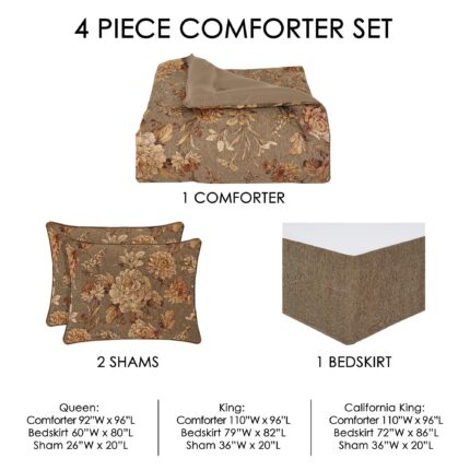 • Queen Set:92″ W x 96″ L Comforter20″ W x 26″ L Standard Pillow Shams60″ W x 80″ L Bedskirt•