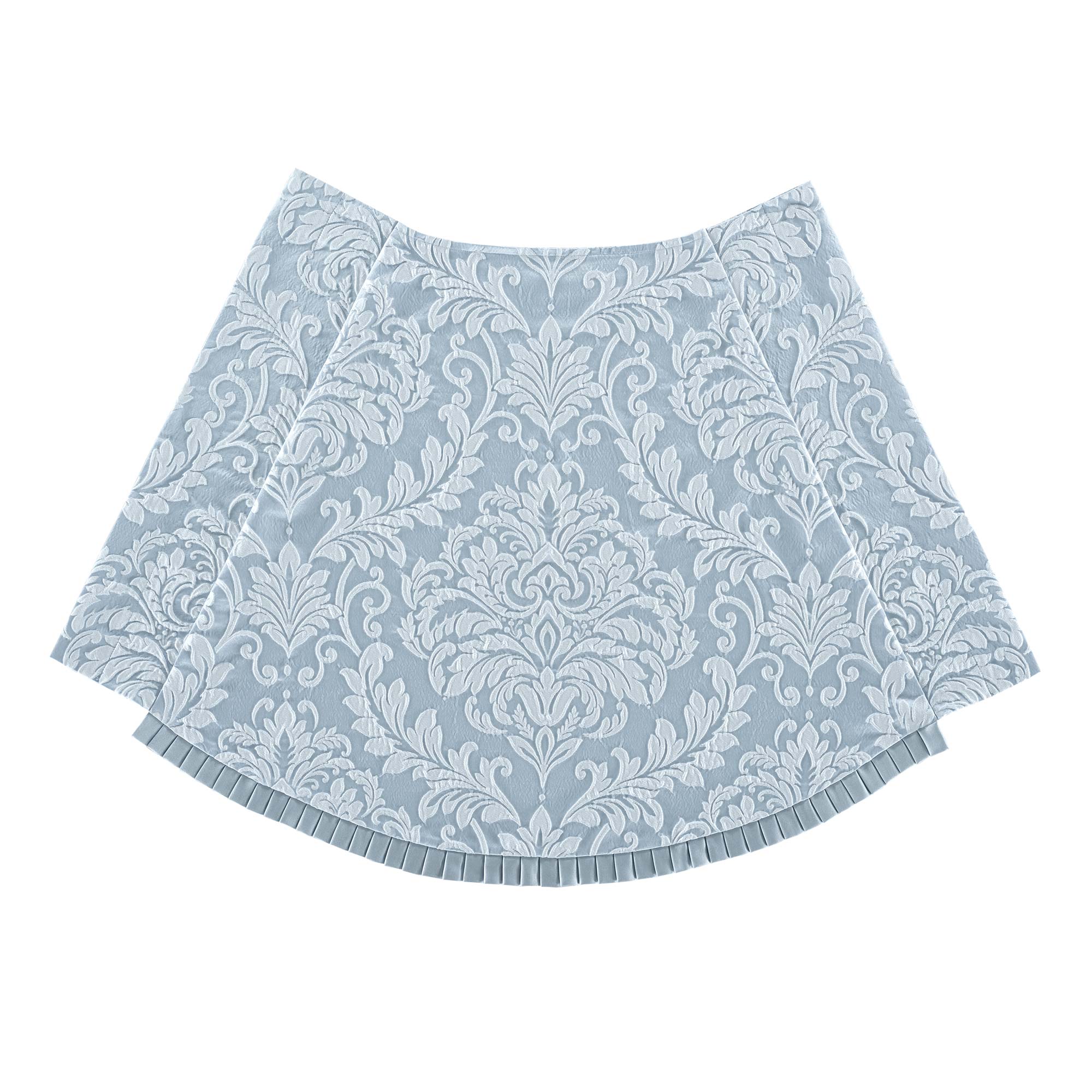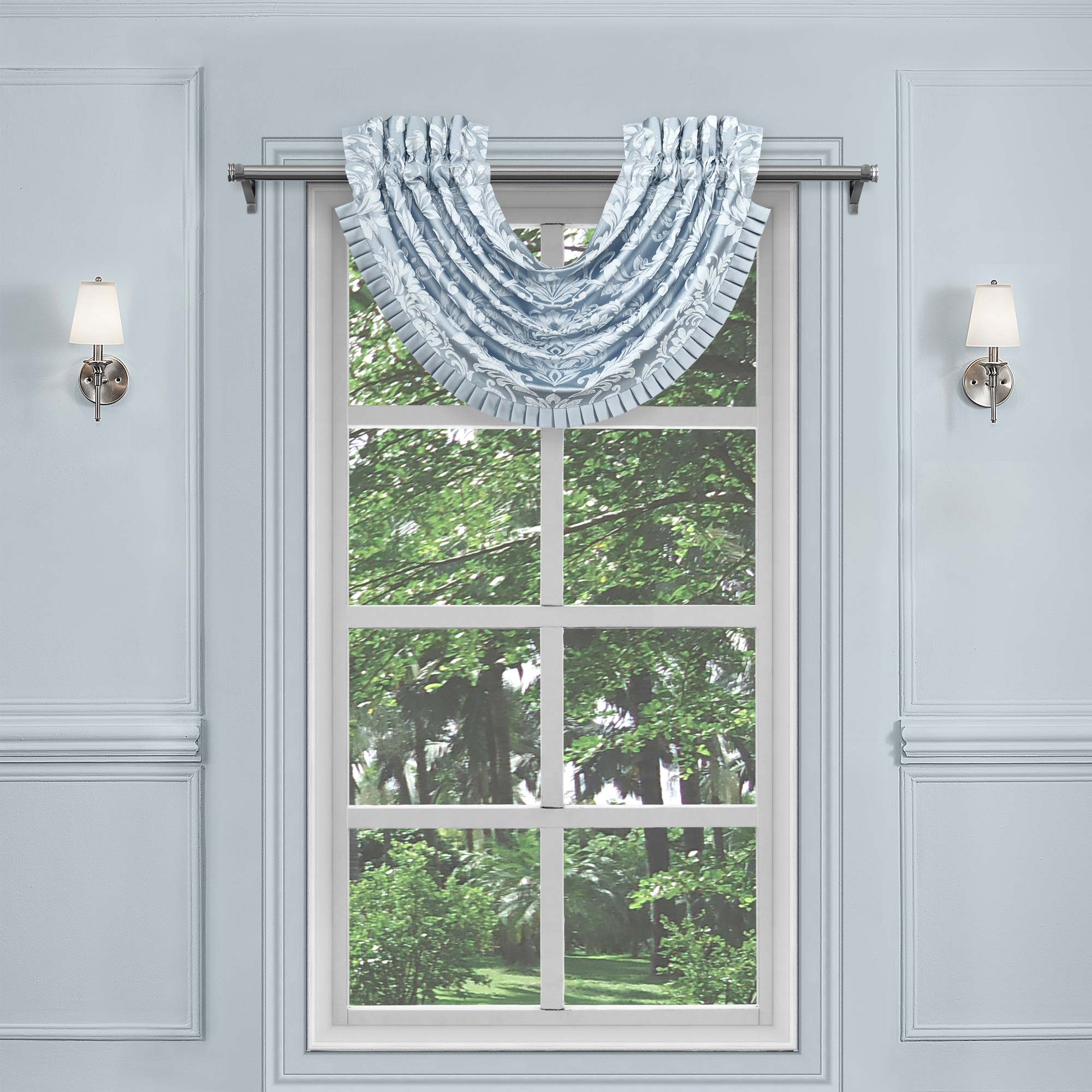 Designed for the Ultimate Look of Luxury, The Malita Waterfall Valance Uses a Grand Woven Jacquard Damask Fabric that is Trimmed with a Pleated Satin Flange. The Powder Blue Tones are Soft Yet Elegant and They are Lined for Insulation and Constructed With a 3 Inch Header With a 3” Rod Pocket for Easy Setup.